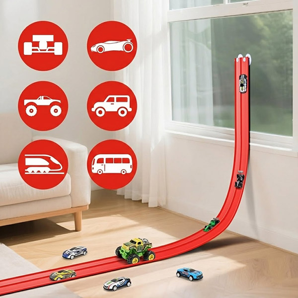 As crianças podem moldar a pista usando objetos do dia a dia para criar saltos, túneis e loops, incentivando a imaginação e a resolução de problemas em vez de brincadeiras repetitivas. Mantém as crianças concentradas por horas sem telas.