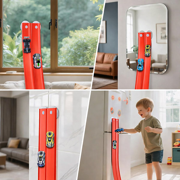 A fixação com ventosas permite que crianças e pais ajustem rapidamente ângulos e layouts, para que a pista possa ser reconstruída repetidamente sem ferramentas ou configurações complexas.