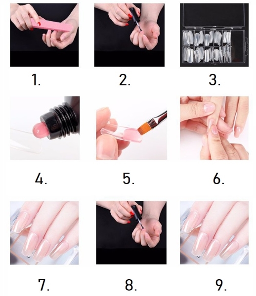 Aplica uma camada fina de poly gel sob a unha artificial que vas a colar na tua unha. Depois de secar sob a luz LED, simplesmente remove a unha artificial.